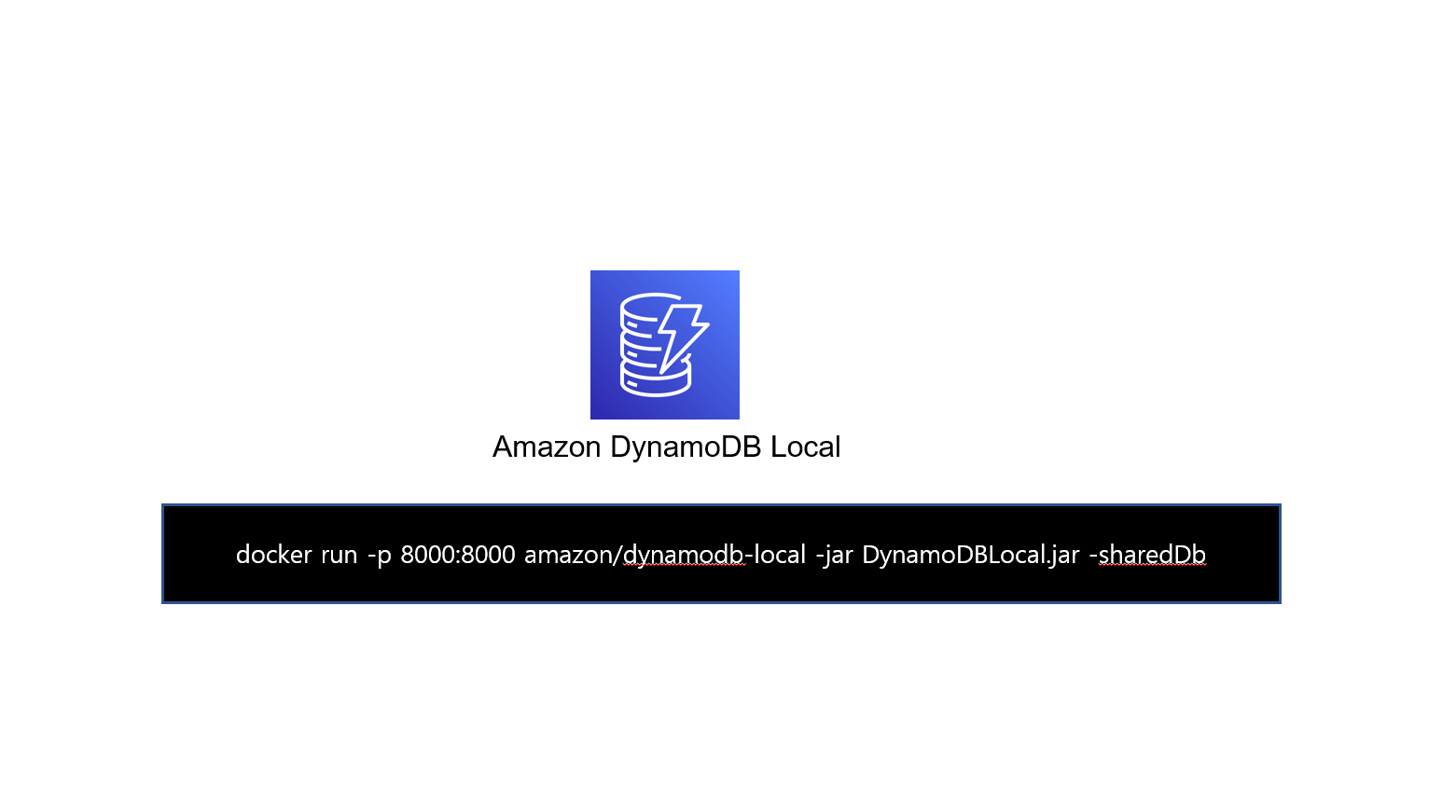 docker run -p 8000:8000 amazon/dynamodb-local -jar DynamoDBLocal.jar -inMemory -sharedDb